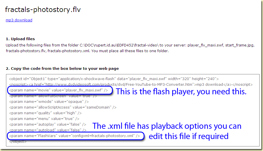 On completion of video conversion it creates an example html page with the html code required to embed the flash player.