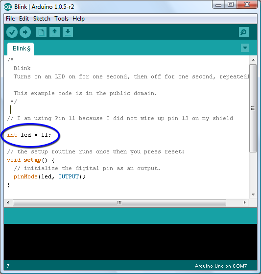 The example Blink program is designed to blink the built in LED on port D13. I have not used D13 on the shield so change the code to use D11