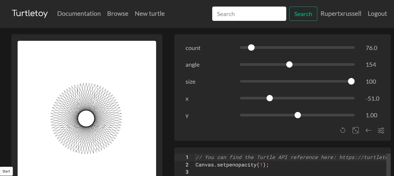 Turtletoy allows you to create generative art using a minimalistic javascript Turtle graphics API. You can only create black-and-white line drawings on a square canvas. By offering a very restrictive environment we not only hope to stimulate creativity, we also make sure that the turtles can (at least theoretically) be plotted using a simple plotter.
