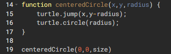 "Did you know you can also write the centeredCircle function like this ``` function centeredCircle(x,y, radius, ext =360) { turtle.jump(x,y-radius); turtle.circle(radius, ext); } ```"