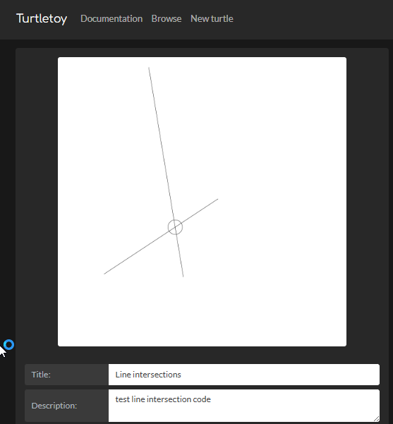 // Compute intersection of the infinite lines // draw lines turtle.jump(x1,y1); turtle.pendown(); turtle.goto(x2,y2); turtle.jump(x3,y3); turtle.goto(x4,y4); const px = ( (x1*y2 - y1*x2) * (x3 - x4) - (x1 - x2) * (x3*y4 - y3*x4) ) / denom;